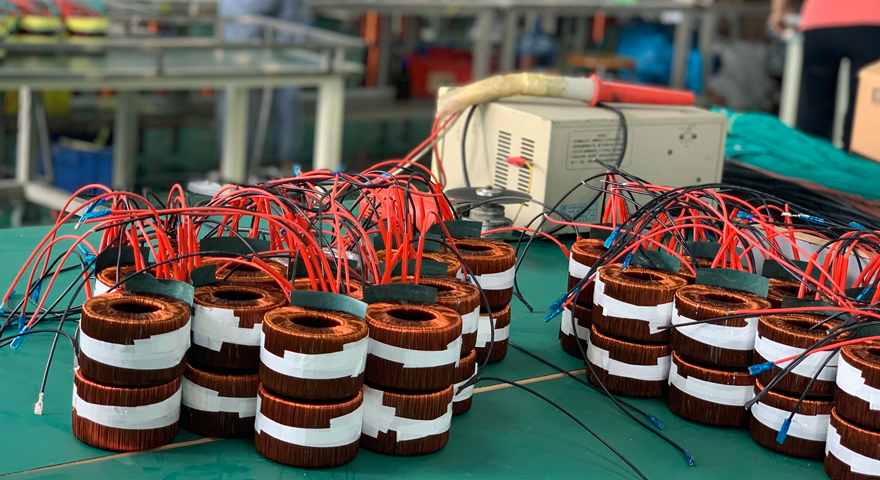 圣元電器生產(chǎn)車間工作臺(tái)正擺放著環(huán)形變壓器半成品,等待技術(shù)人員完成下一個(gè)生產(chǎn)步驟。