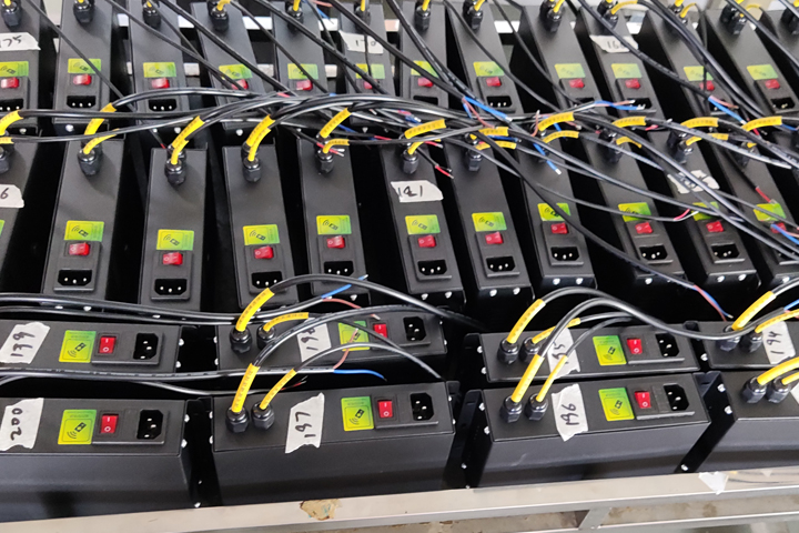 圣元電器的小推車上整齊擺放著等待測(cè)試的AC桌面電源。