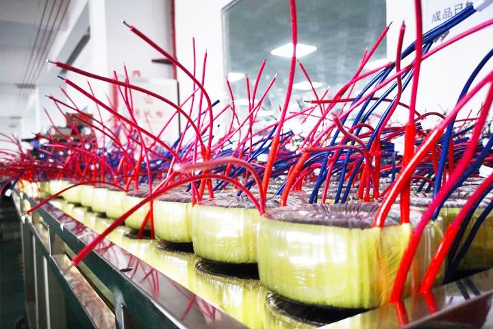 圣元電器的員工認(rèn)真地將制作并檢測完畢的環(huán)形變壓器整齊在擺放區(qū)的小推車上。