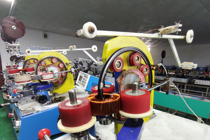 圣元變壓器的員工使用繞制機(jī)把銅線緩慢均勻地繞制在聚脂薄膜包裹好的鐵芯上。
