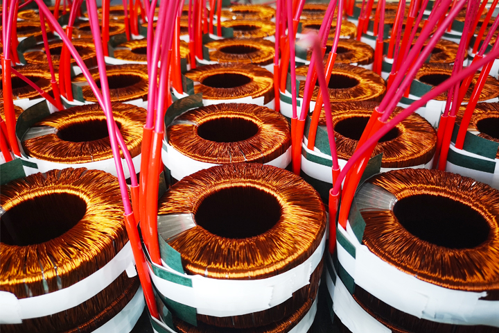圣元電器的員工將制作好的的環(huán)形變壓器半成品整齊有序地擺放好。